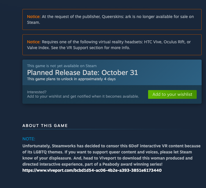 We are so tired of this. Queerskins: a love story and Queerskins: ARK have been rejected from SteamVR store. Everyone talks about diversity and inclusion but we have to deal with this all the time. (not even a mention on the blog when Queerskins got released on Oculus store either) There is almost NO queer content in VR, certainly nothing that shows anything with even a hint of sexuality. Happy to have a discussion with anyone in power. The silence is deafening.