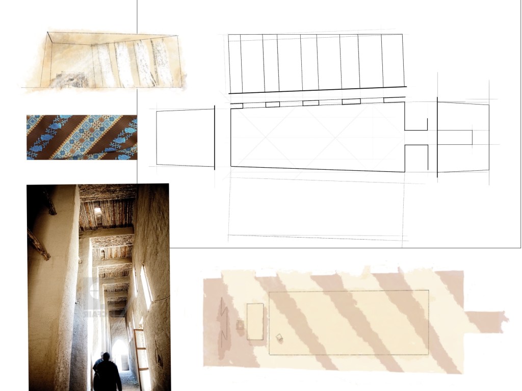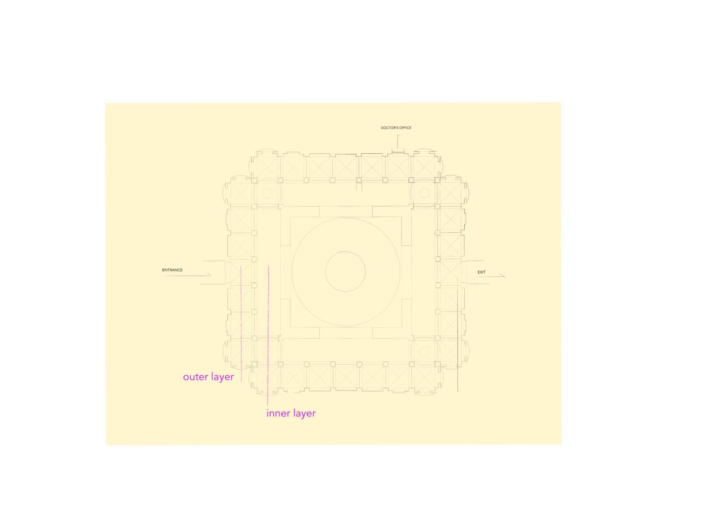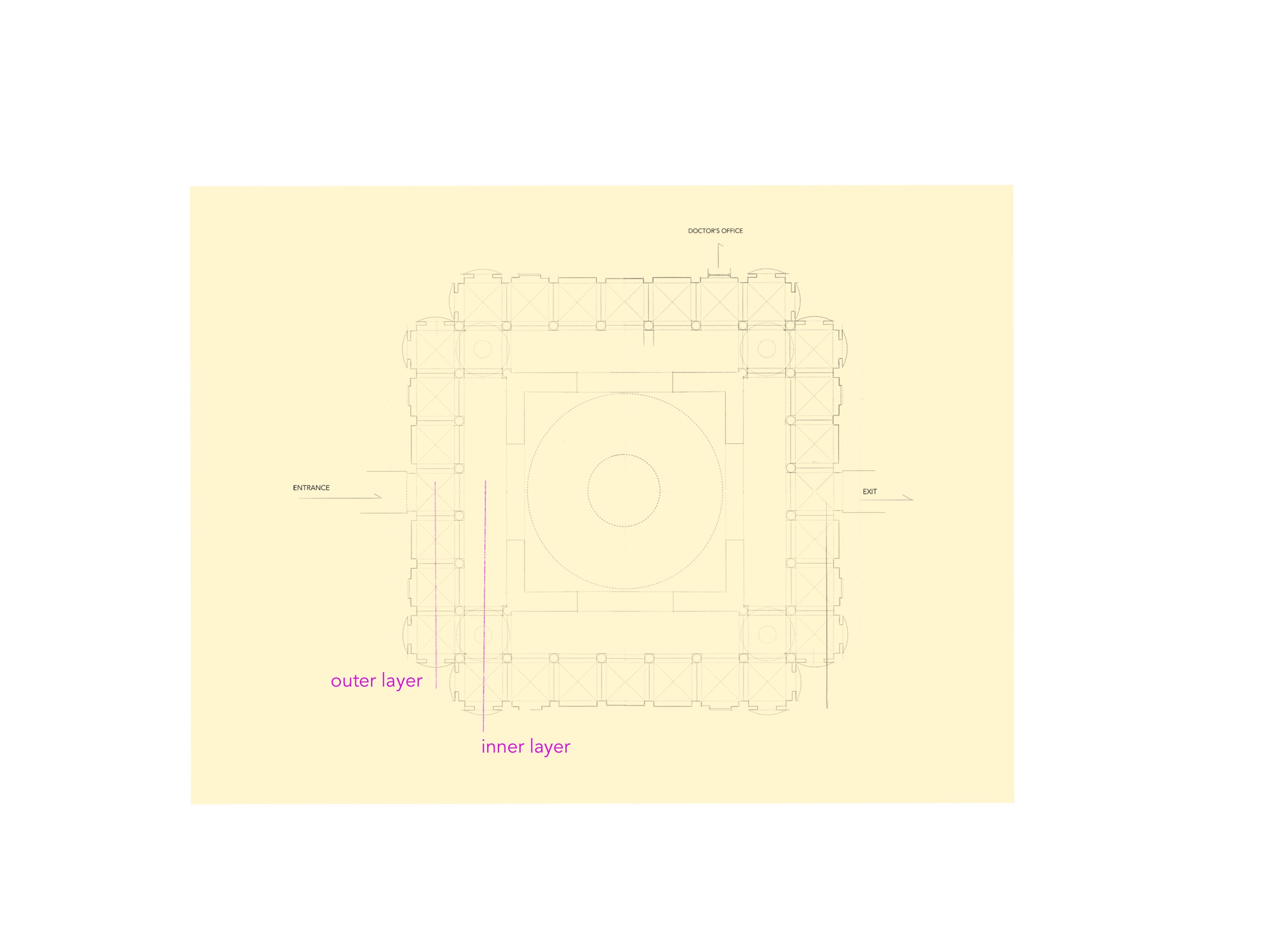 For FLY ANGEL SOUL we create a heterotopic building and environment. On the outside, the medical clinic references the soft edges and earth colors of Malian mud buildings. However, the interior itself is rigid. Whereas, the exterior displays the passage of time as erosion, inside time is regulated, represented by a rhythm of repeated arches.